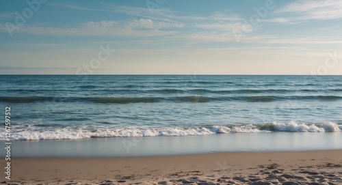 Obraz premium Serene Beach Scene with Gentle Waves and Calm Sea Under a Clear Sky Featuring Empty Space for Text or Overlay