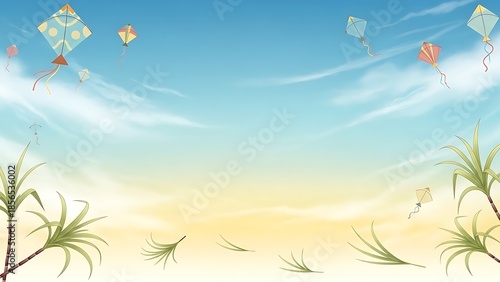 © Brishy , Obraz premium Serene beach scene with kites flying high in the sky surrounded by palm trees