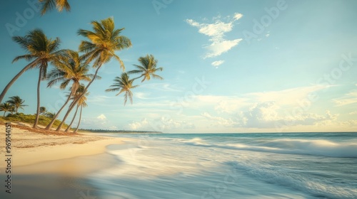 © BerkahStock, Fototapeta premium Serene beach scene with palm trees and gentle waves under a clear sky.