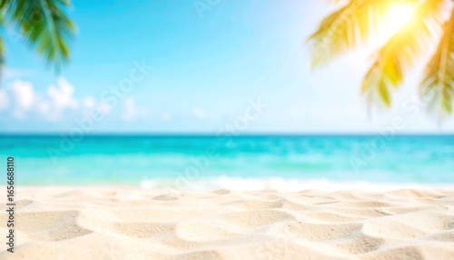 © PANGERAN, Fototapeta premium Serene beach scenery with palm trees in summer, Relaxing tropical paradise at sea with turquoise water and white sand, perfect for vacation