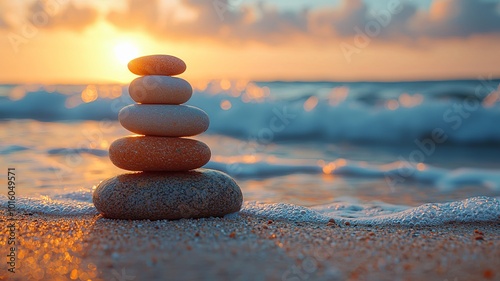 © Nuntapuk, Fototapeta premium Serene Beach Stones at Sunset