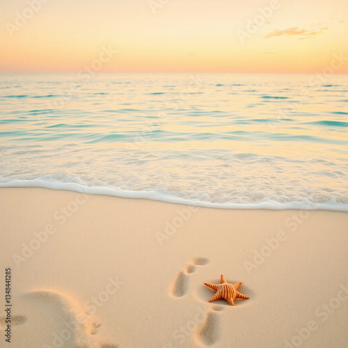 © vemulapalli, Naklejka premium Serene Beach Sunset with Starfish – Peaceful Coastal Scene