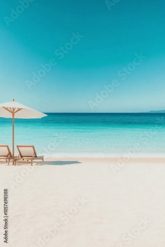 Fototapeta premium Serene beach view with a sun lounger and umbrella under a clear sky and calm...