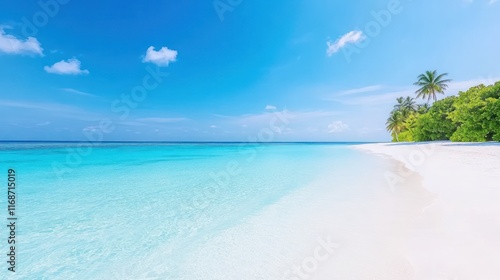© julio, Fototapeta premium Serene beach with clear water and palm trees under a blue sky.