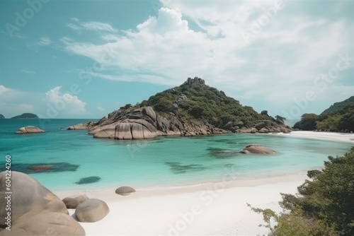 © AkuAku, Obraz premium serene beach with crystal clear water and rocky terrain Generative AI