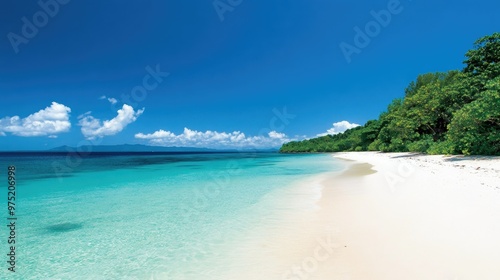 © hanisah, Fototapeta premium Serene beach with soft and a clear blue sky