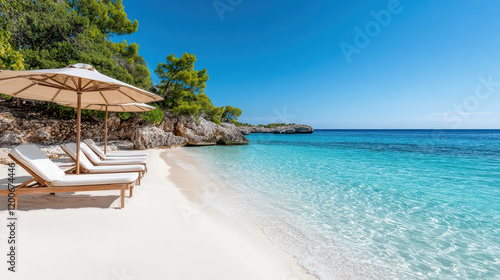 © siraphol, Obraz premium serene beach with sun loungers and umbrellas under clear blue sky