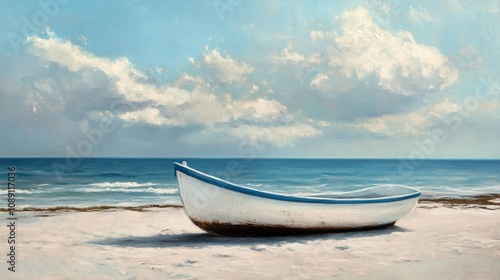 © NeuralNiche, Naklejka premium Serene Beachfront Scene Featuring a White Boat with Blue Stripe Resting on Soft Sand Under a Bright Sky with Fluffy Clouds and Calm Ocean Waves