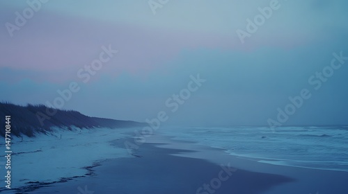 © Jamal, Naklejka premium Serene Beachscape at Dusk Tranquil Ocean Waves and Sandy Shore