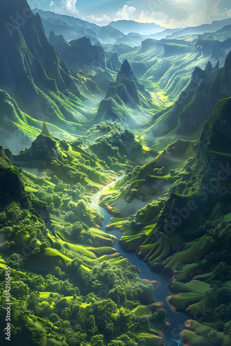 Fototapeta premium Serene Beauty: A River Winding Through a Verdant Valley Under the Radiant Sun