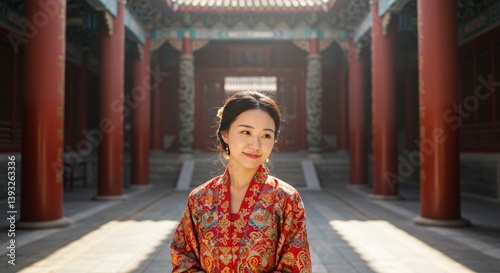 Fototapeta premium Serene Beauty: Young Woman in Traditional Chinese Dress at Ancient Temple - A young Asian woman, serene expression, wears a red and gold embroidered Chinese dress. Symbolizing grace, tradition