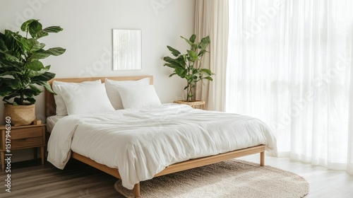 Fototapeta premium Serene Bedroom Interior Design: Minimalist White Bedding, Natural Light, and Lush Greenery