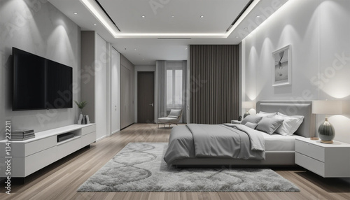 © Sumitra, Fototapeta premium Serene bedroom sanctuary a calming space for rest and rejuvenation illuminated with bright even soft lighting.