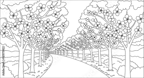 Fototapeta premium Serene Black and White Line Art: Blossoming Cherry Trees Frame a Winding...