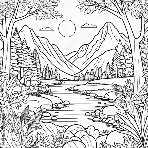 © procreation, Naklejka premium Serene Black And White Mountain River Landscape Drawing