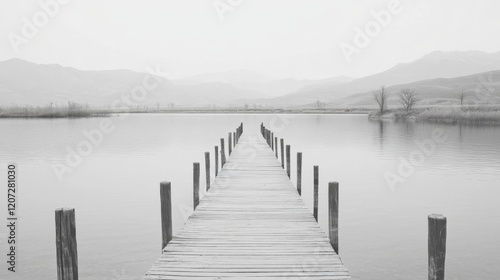 Naklejka premium Serene black and white photo of a wooden pier extending into a calm lake,...