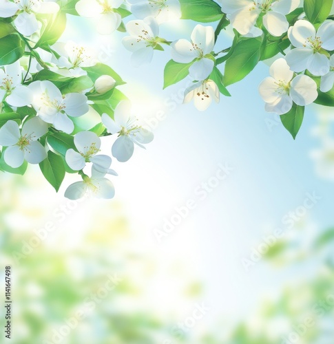 Fototapeta premium Serene Blossom Background with White Flowers and Lush Green Leaves Set...