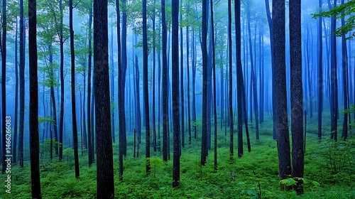 © Thanathon, Fototapeta premium Serene Blue Forest Misty Morning in a Lush Green Woodland Tall Trees Stand in a Foggy Atmosphere