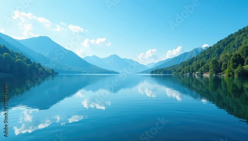 © Rachanon, Fototapeta premium Serene blue lake, tranquil surface reflecting sky, scene, pond, relaxing