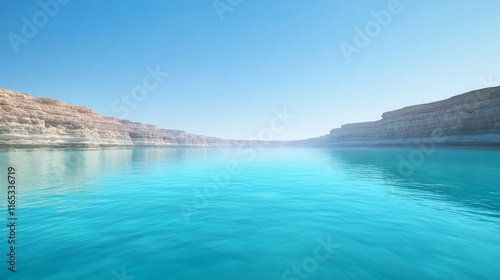 © f., Fototapeta premium Serene blue lake with rocky cliffs under clear sky