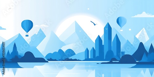 © Mr. Mads, Naklejka premium Serene Blue Landscape With Hot Air Balloons and Cityscape