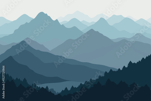 © Sharati, Naklejka premium Serene Blue Mountain Range A Panoramic View of Majestic Peaks and Tranquil Forests