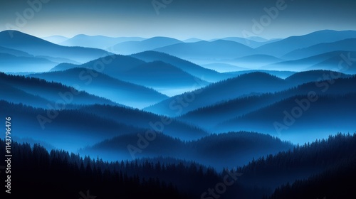 Fototapeta premium Serene blue mountain range at dawn, misty layers.