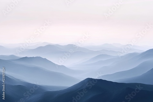 Fototapeta premium Serene blue mountain range landscape in misty haze.