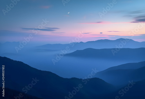 © Sugiri80, Fototapeta premium Serene Blue Mountains: Misty Sunset Landscape