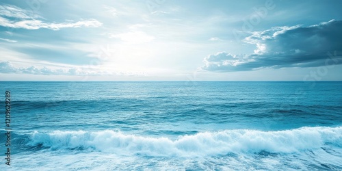Fototapeta premium Serene blue ocean horizon with gentle waves in foreground and soft clouds above creating a tranquil calm backdrop with ample copy space.