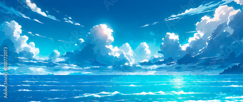© Creative mind, Obraz premium Serene blue sku and ocean in anime manga style. Banner format.