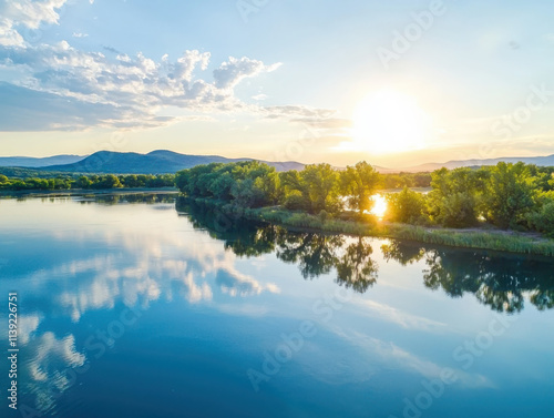 © Nakorn, Fototapeta premium Serene blue sunrise over calm lake reflecting trees and mountains peaceful landscape view nature photography