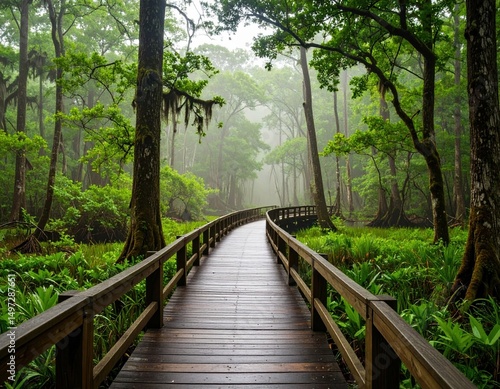 © Simon, Fototapeta premium Serene boardwalk through lush green forest with misty atmosphere