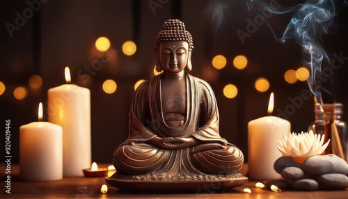 Fototapeta premium Serene Buddha Statue Surrounded By Candles And Incense In A Calm Setting