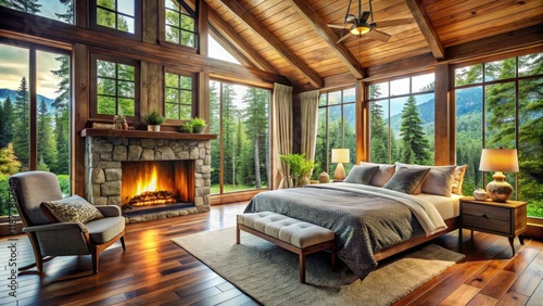 Naklejka premium Serene Cabin Bedroom: Cozy Fireplace, Panoramic Forest Views, Relaxing Retreat