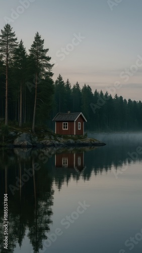 Fototapeta premium Serene cabin by misty lake mobile wallpaper