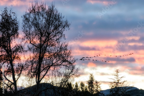 © Lux Blue, Obraz premium Serene California sunset view with bare tree silhouettes and migrating birds flying in V formation; soft focus