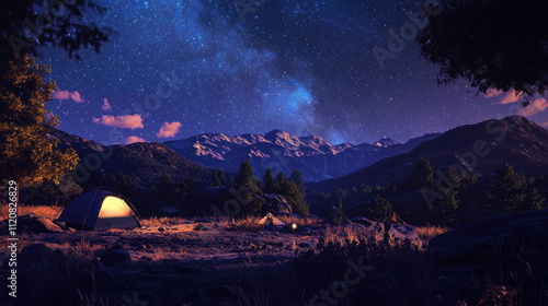 Naklejka premium serene camping scene under starry sky, featuring tent surrounded by mountains...