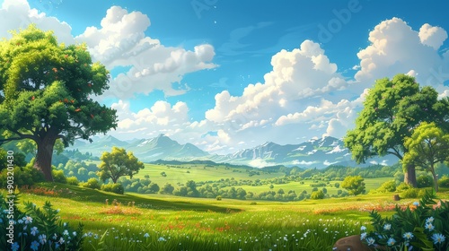 © BG_Illustrations, Fototapeta premium Serene Cartoon Nature Scene with Lush Greenery