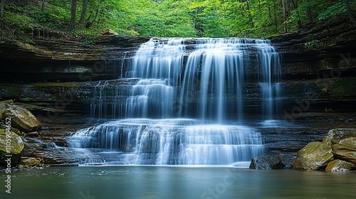 Fototapeta premium Serene cascading waterfall in lush forest.