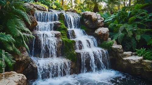 Naklejka premium Serene cascading waterfall in lush tropical garden.