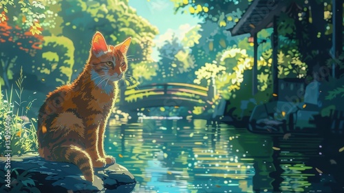 © AnanchaiP, Obraz premium Serene Cat by Tranquil Water