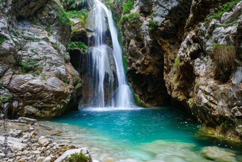 Fototapeta premium Serene cave waterfall and underground river on white backdrop, creating a...