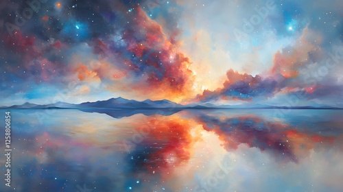Fototapeta premium Serene Celestial Landscape- Mountains Mirrored in Starry Lake