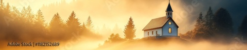 © Ryzhkov, Fototapeta premium Serene Chapel at Dawn Tranquil Mountain Sanctuary in Misty Golden Light