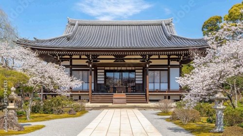 © AizayStock, Obraz premium Serene Cherry Blossom Garden with Framed Shrines