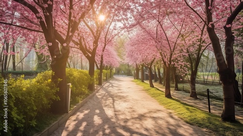 Obraz premium Serene Cherry Blossom Pathway in Springtime Light