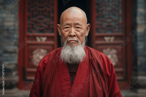 Naklejka premium Serene Chinese elder dons traditional monk's robe, embodying wisdom and...