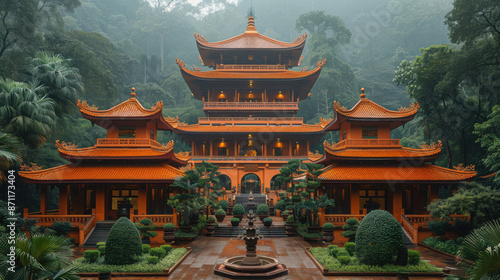 Naklejka premium Serene Chinese-style Painting of Wat Pa Ban Tat Forest Monastery with Lush...