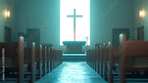 © sup, Naklejka premium Serene Church Interior: A Tranquil Space of Worship